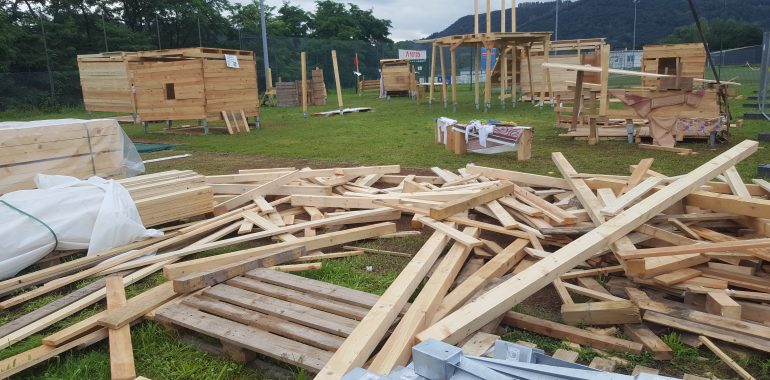 Auf einer großen Wiese, wird es sehr viel Holz, Nägel und Werkzeug wie Hämmer, Sägen und anderes Werkzeug zur Holzbearbeitung bereitgestellt. Daraus können eigene Gebilde gebaut werden. Dabei gibt es erstmal keine Vorgaben – lediglich das Material und die Anforderungen an Standsicherheit zeigen Grenzen auf. Damit werden ganz spielerisch die Gesetze der Physik beachtet.