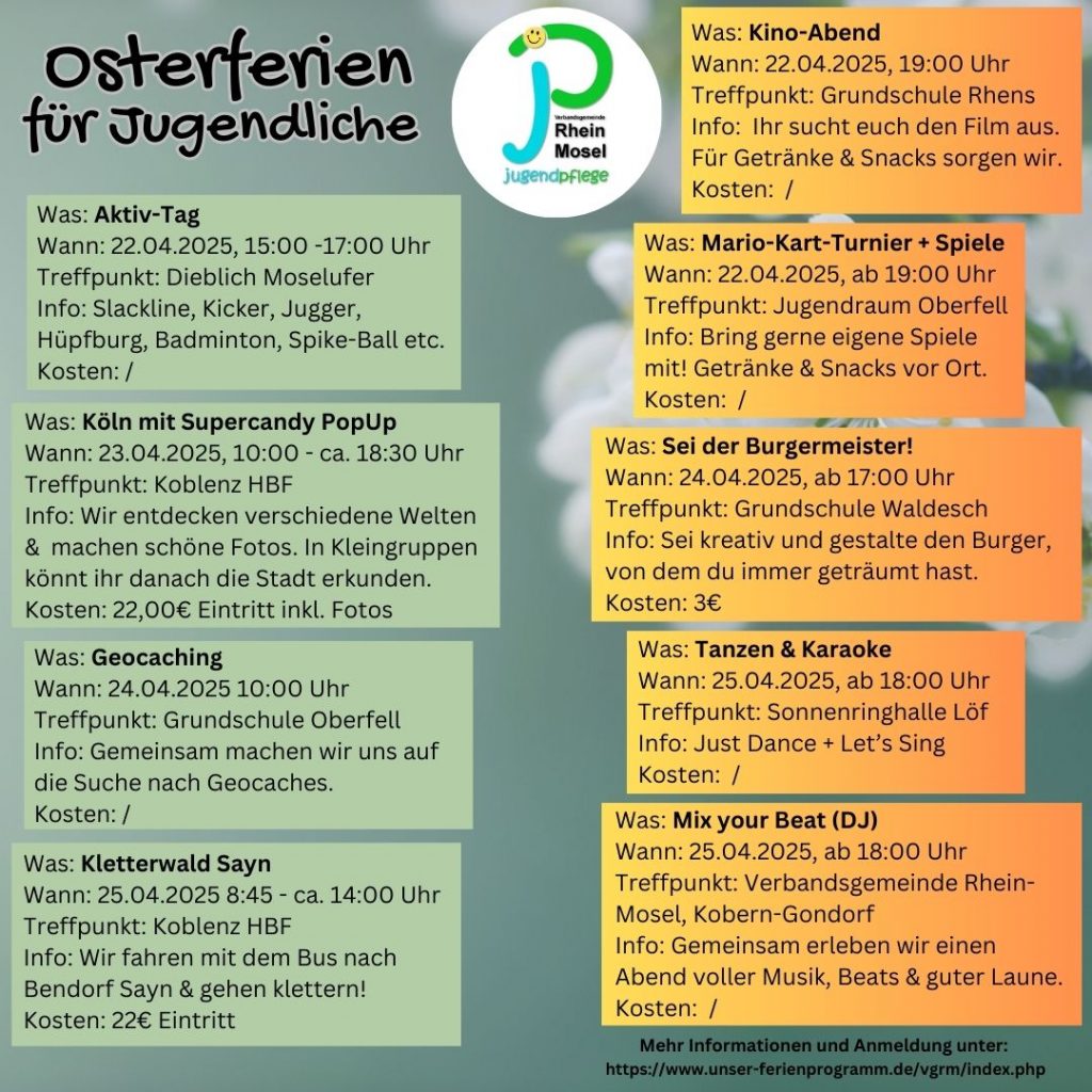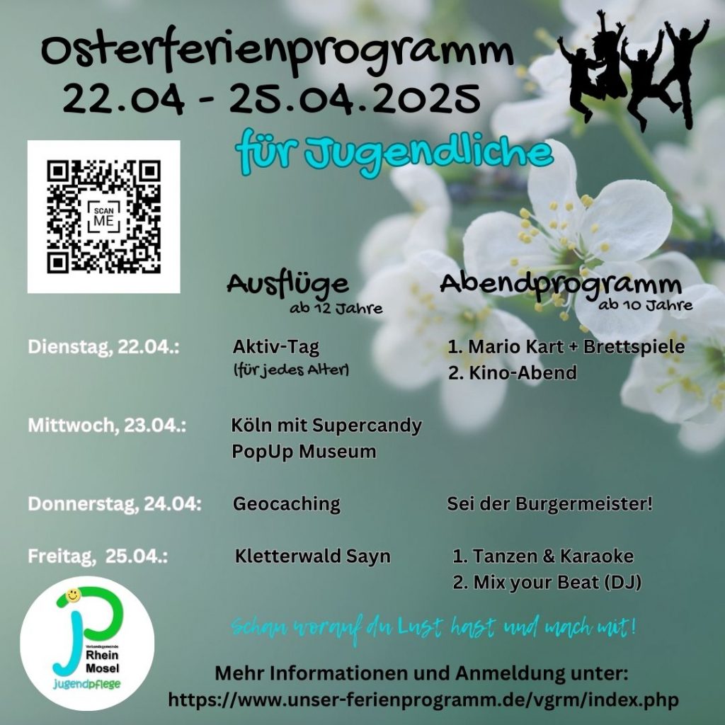 In der zweiten Woche der Osterferien (22.04.-25.04.2025) haben wir verschiedene Ausflüge und Aktionen für Jugendliche ab 12 Jahren (teilweise ab 10 Jahren) geplant. Schau gerne, worauf du Lust hast und melde dich an bzw. komm vorbei! Du kannst deine Freund*innen mitbringen, auch wenn sie nicht in der Verbandsgemeinde wohnen.